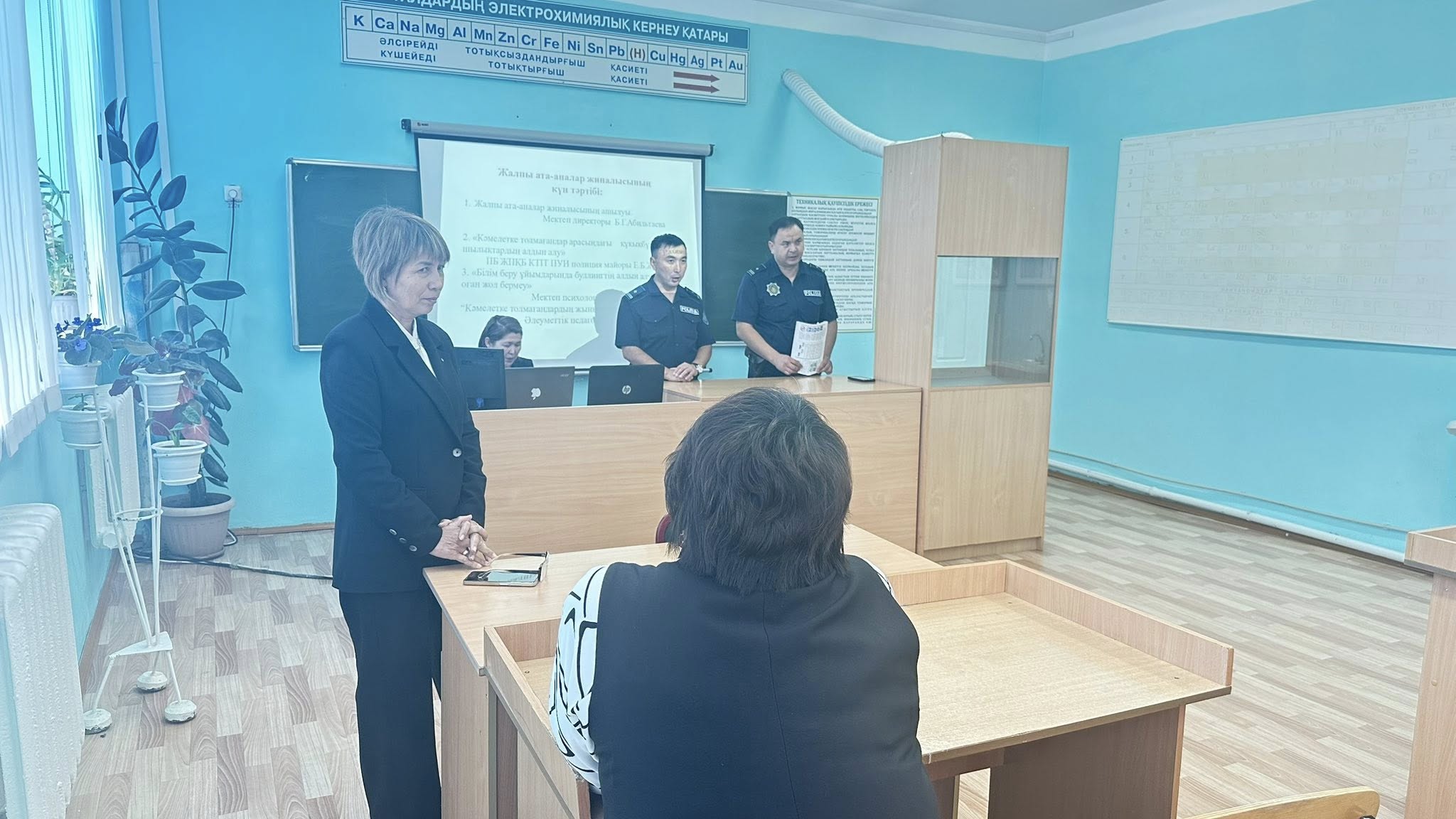 05 қыркүйек күні мектебімізде Айыртау ПБ ЖПҚБ КІТІТ ПУИ полиция майоры Е.Б.Жунусов және мектеп әкімшілігінің қатысуымен ұстаздар мен ата-аналар арасында жиналыс өткізілді.