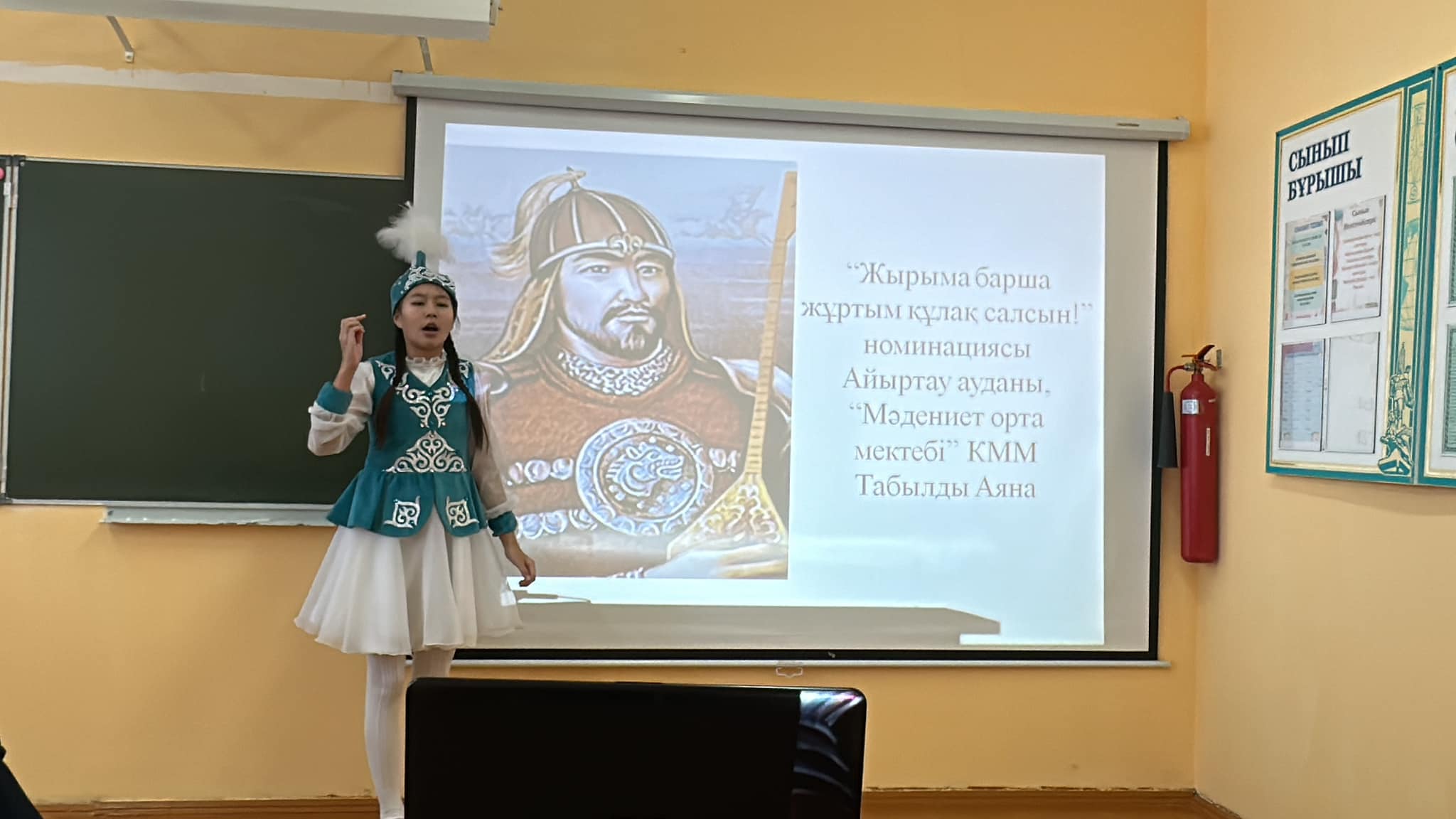 Қараша айының 15 күні "Дауылпаз баба -Қожаберген" атты байқаудың облыстық кезеңі өтті. Байқау бірнеше номинациядан болып, оқушылар өз өнерлерін көрсетті. Мектебіміздің 7-сынып оқушысы Табылды Аяна "Жырыма барша жұртым құлақ салсын!" номинациясы бойынша жырау өлеңдерін мәнерлеп оқу бойынша облыстық кезеңнен III орынға ие болды. Жетекші ұстазы мен оқушымызды құттықтаймыз!!!