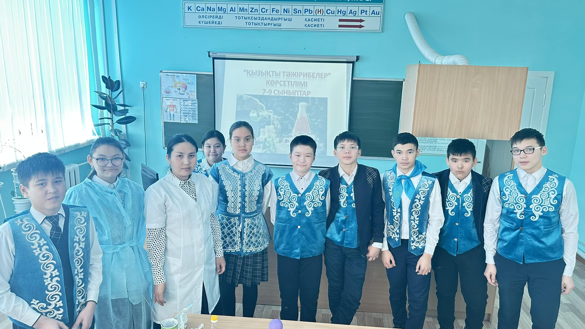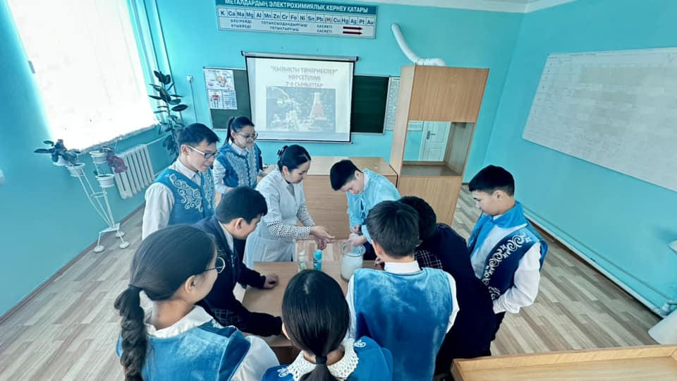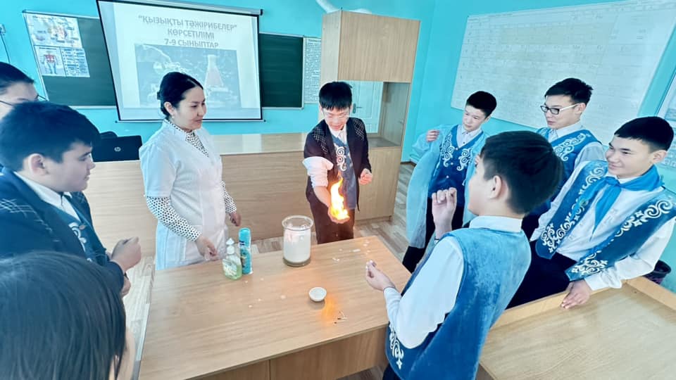 Химия пәнінің мұғалімі Асима Ерденовна “Қызықты тәжірибелер” көрсетілімін өткізді.
