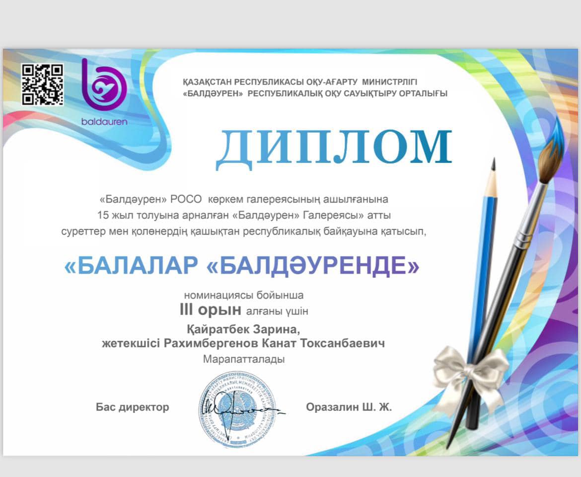 “Балдәурен” Галереясы” атты суреттер мен қолөнердің қашықтықтан республикалық байқауынан Қайратбек Зарина ІІІ орынға ие болды.