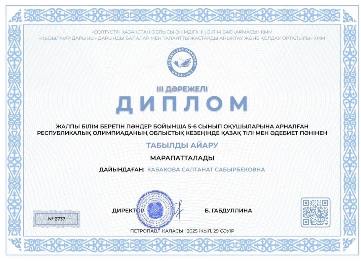 #Біртұтас_тәрбие 06 мамыр күні Жалпы білім беретін пәндер бойынша 5-6 сынып оқушыларына арналған Республикалық олимпиаданың облыстық кезеңінде мектебіміздің 5-сынып оқушысы Табылды Айару қазақ тілі мен әдебиеті пәнінен III орынды иеленді.