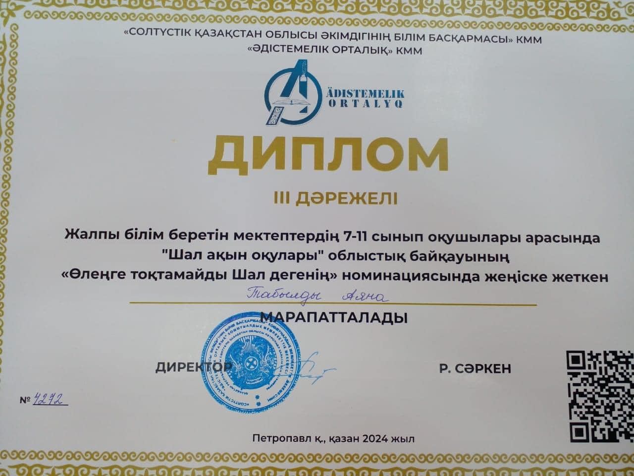 16 қазан күні жалпы білім беретін мектеп оқушыларының арасында өткен облыстық ІІІ- кезеңі "Шал ақын оқулары" байқауы Шал ақын ауданында Ы. Ыбыраев ауылы Маркен Ахметбеков атындағы орта мектебінде өтті. Аталған байқауға мектебіміздің 7-сынып оқушысы Табылды Аяна қатысып, “Өлеңге тоқтамайды Шал дегенің” атты номинациясында 3 орынға ие болды. Жеңісің құтты болсын!!!