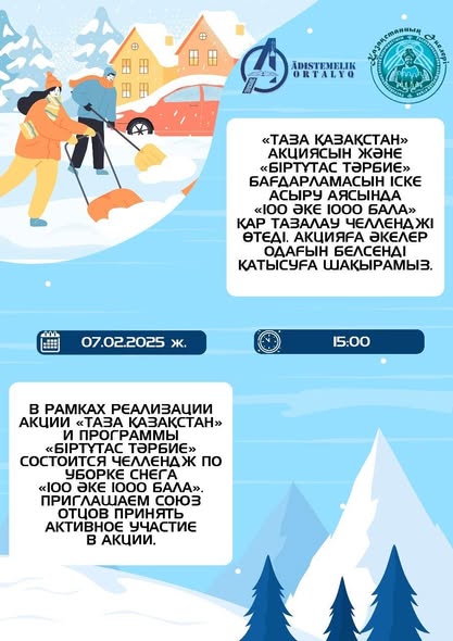 "Таза Қазақстан" акциясын және "Біртұтас тәрбие" бағдарламасын іске асыру аясында "100 әке 1000 бала" қар тазалау челленджі өтті.