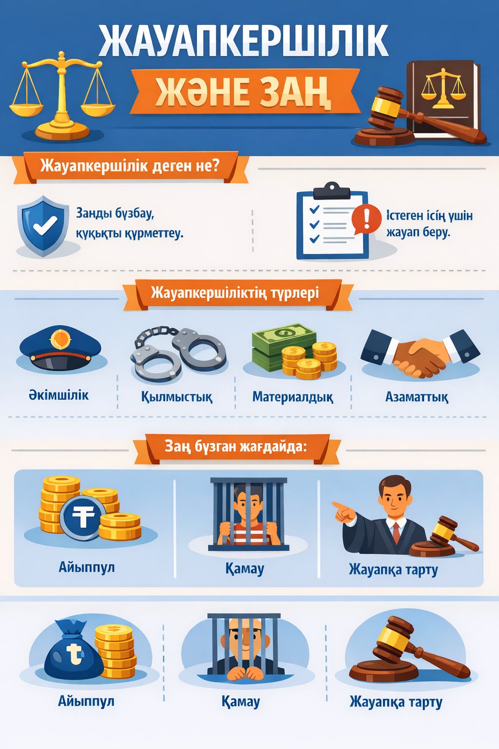 Адал азамат біртұтас тәрбие бағдарламасының "Заң және тәртіп" тұжырымдамасы негізінде "Жауапкершілік және заң” тақырыбында салықтар мен салық саласындағы азаматтық жауапкершілікке байланысты және интернеттегі ата-аналар бақылаулары бойынша инфографикалар таратылды.