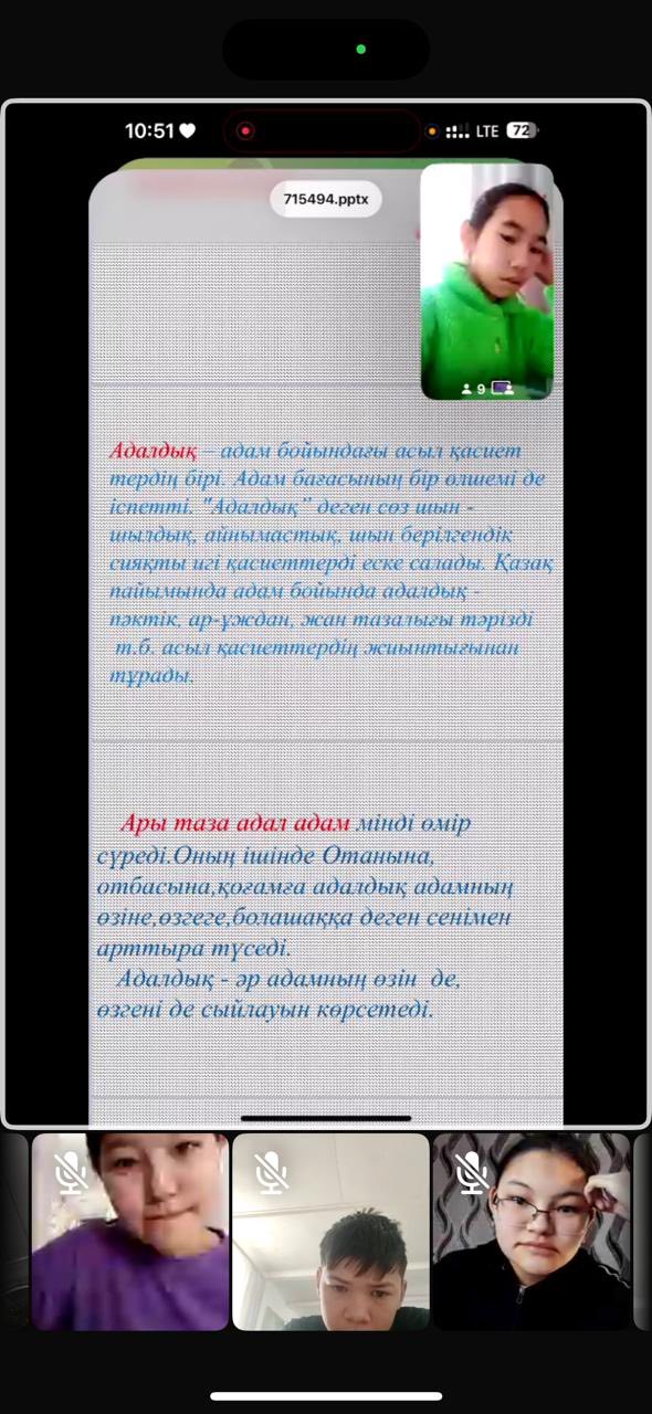 Адал азамат біртұтас тәрбие бағдарламасының "Заң және тәртіп" айлығы негізінде 15 қаңтар күні "Адалдық және әділдік” тақырыбында “Адал ұрпақ” еріктілерімен онлайн форматта адалдық сағаты өткізілді.