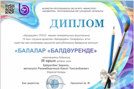 “Балдәурен” Галереясы” атты суреттер мен қолөнердің қашықтықтан республикалық байқауынан Қайратбек Зарина ІІІ орынға ие болды.